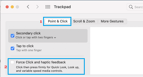单击Apple 徽标>系统偏好设置>触控板> 在下一个屏幕上,切换到“指向并单击”选项卡并禁用“强制单击”和“触觉反馈”选项。