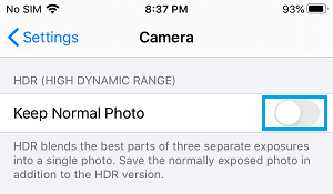为了节省存储空间,您可能希望将 iPhone 设置为仅在设备上保存照片的 HDR 版本,方法是前往“设置” > “相机”并将“保持普通照片”选项旁边的切换开关移至“关闭”位置。