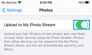 禁用 iCloud 照片后,前往“设置” > “照片”并将“上传到我的照片流”旁边的开关移动到“开”位置。