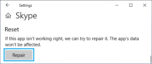有时,问题是由于 Skype 应用程序损坏造成的。这可以通过使用 Windows 10 中可用的修复选项来修复。