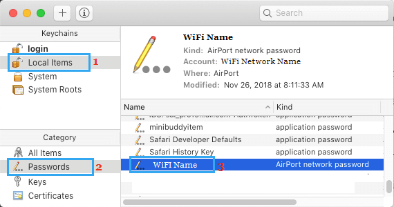 2.在下一个屏幕上,单击左窗格中的本地项目>密码。在右窗格中,双击您的WiFi 网络名称。