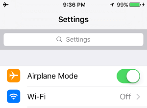 通过将切换开关移动到ON位置,转到设置> 启用飞行模式。