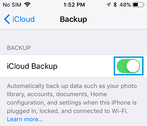 2.在下一个屏幕上,通过将切换开关移动到ON位置来启用 iPhone 上的iCloud 备份。