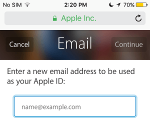 6.在下一个屏幕上,输入您要用作 Apple ID的新电子邮件地址,然后点击下一步或 继续按钮。