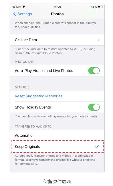 第 1 步:首先,前往 iPhone 的“设置” > “照片”。在“传输到 Mac 或 PC”选项中,确保选择“保留原件”以确保您的图像保留其原始质量并且在传输过程中不会被压缩。不用担心那些讨厌的 HEIC 文件——Windows 现在可以轻松读取它们了!
