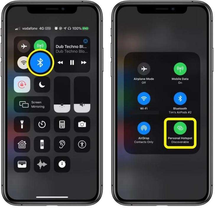 如果你想阻止其他设备连接到你的 iPhone 或 iPad 热点,你可以通过控制中心这样做:长按蓝牙按钮,如果下一个屏幕上的个人热点按钮是绿色的,点击它使你的热点不可发现。