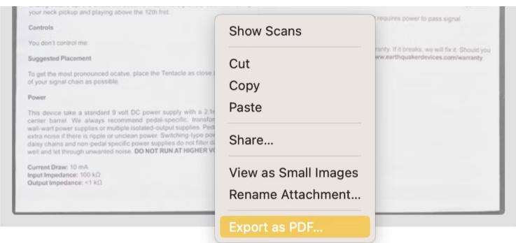 在 macOS 上将扫描图像导出为 PDF 很简单。您需要做的就是按住 Control 键并单击图像,然后在弹出菜单底部选择“导出为 PDF” 。选择保存文件的名称和位置,然后点击保存。