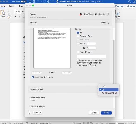 从 Mac 上的 Microsoft Office 应用程序进行双面打印同样简单。与 Chrome 一样,与原生 Mac 应用程序相比,它只是具有不同的打印菜单布局。
